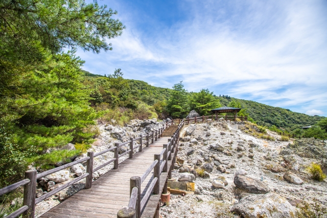「硫黄の香りが漂う温泉街を歩きながら、温泉卵を片手にぶらぶら散策する」